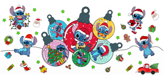 Festive illustration featuring Stitch from Lilo & Stitch in various Christmas-themed poses, surrounded by colorful ornaments, gifts, and holiday decorations.UV Transfersdtf regular iron