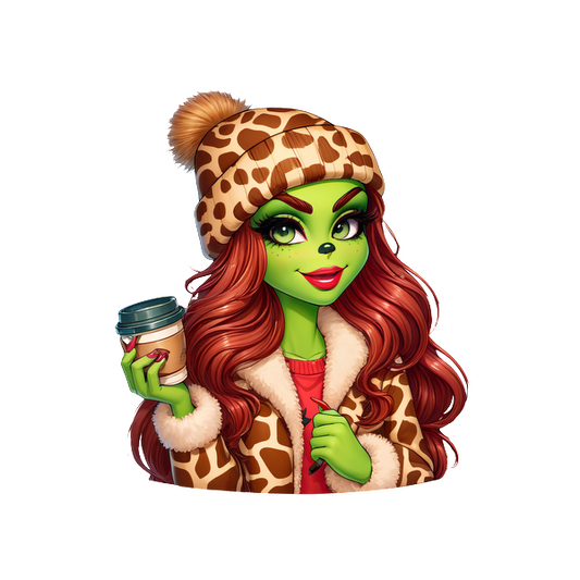 A stylish character with green skin, wearing a cozy giraffe-patterned hat and furry coat, holding a coffee cup.DTF Transfers dtf prints