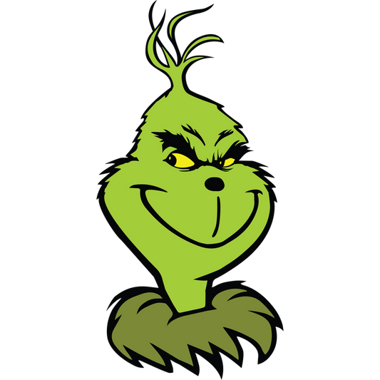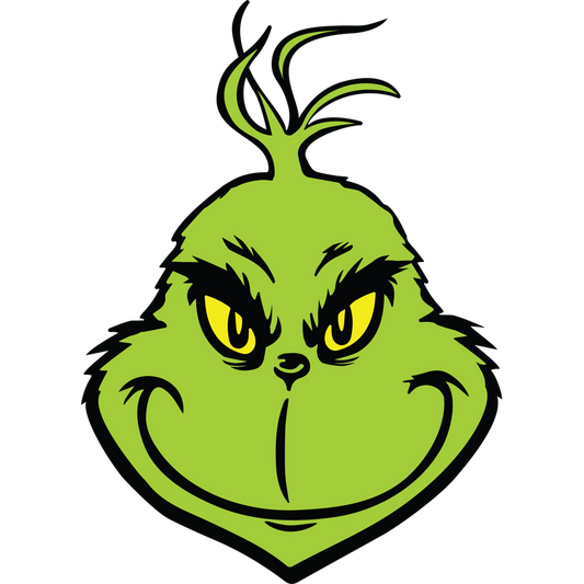 A playful illustration of the Grinch, featuring his signature mischievous smile, green fur, and striking yellow eyes.DTF Transfers dtf transfers dtf prints