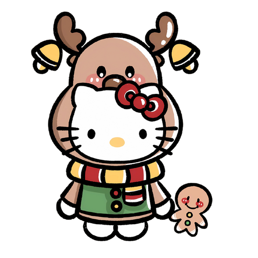 This festive illustration features Hello Kitty dressed in winter attire, accompanied by a reindeer and a cheerful gingerbread cookie.DTF Transfers