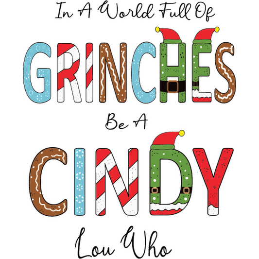 Festive and playful, this colorful text features "GRINCHES" and "CINDY" adorned with fun holiday elements and designs.DTF Transfers dtf transfers dtf transfers