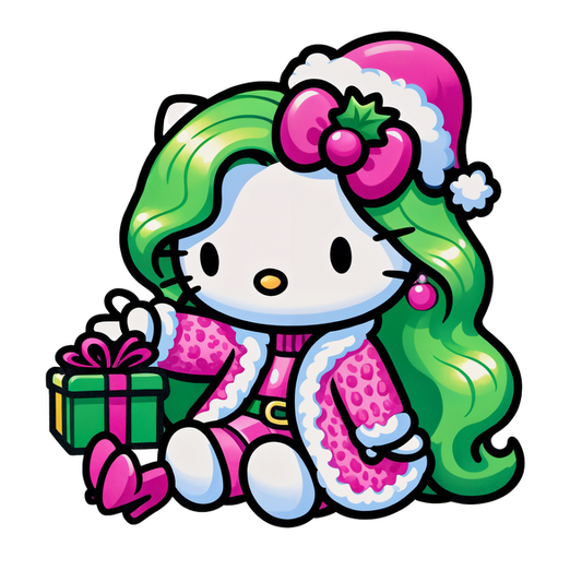 Un personaje festivo de Hello Kitty con cabello verde, vistiendo un abrigo de invierno rosa y un gorro de Papá Noel, sosteniendo un regalo. Transferencias DTF