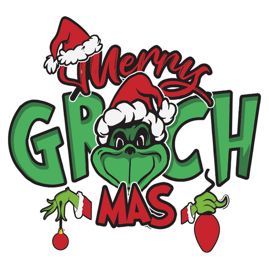 Celebrate the season with this playful "Merry Grinchmas" design featuring the mischievous Grinch in a festive Santa hat!DTF Transfersdtf regular iron