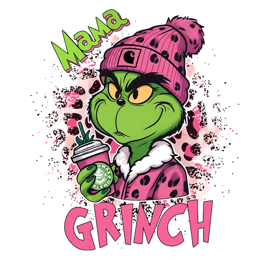 This playful illustration features the Grinch in a cozy pink outfit and hat, holding a coffee cup, embodying a fun, festive spirit.DTF Transfers