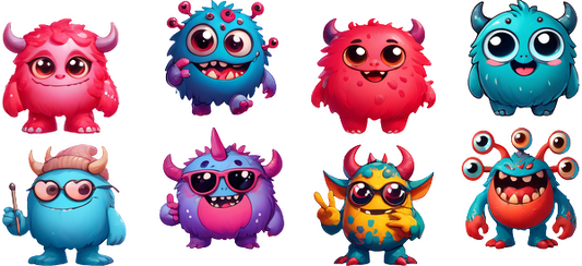 A colorful collection of cute cartoon monsters, each with unique features and vibrant designs, showcasing playful expressions and styles.UV Transfersdtf regular iron