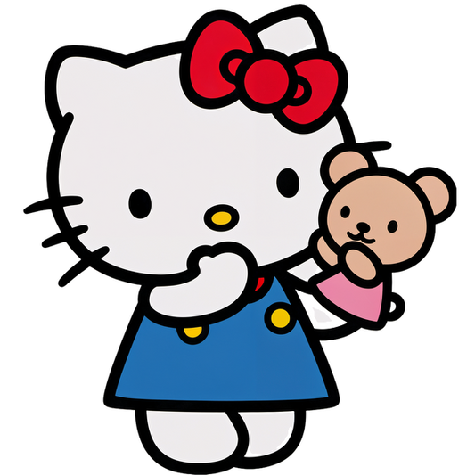 Hello Kitty luce encantadoramente vestida con un vestido azul y un lazo rojo, sosteniendo suavemente a su adorable osito de peluche. Transferencias DTF