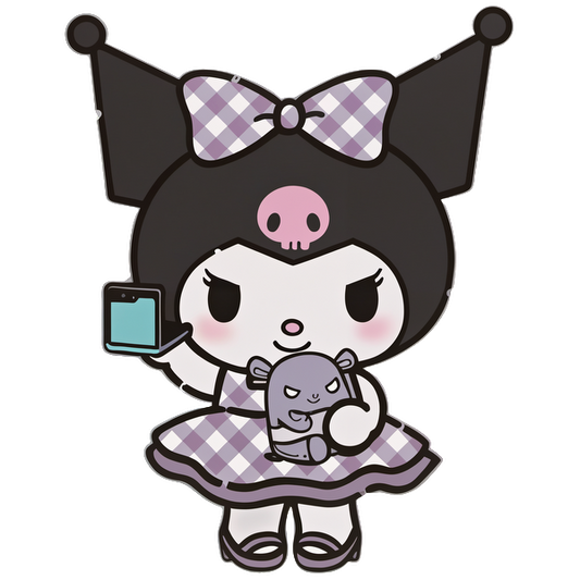 Precio habitual A partir de £0.75 GBPPrecio habitualPrecio unitario / por£2.40 GBPPrecio de oferta A partir de £0.75 GBPThis cute character features a girl in a checkered dress, holding a smartphone and a plush toy, with whimsical horns.DTF Transfers