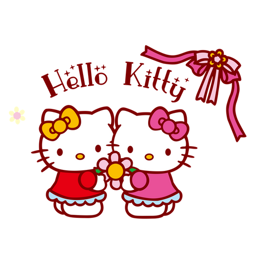 Adorable illustration of two Hello Kitty characters holding a flower, adorned with colorful bows and the playful text "Hällö Kittij."DTF Transfers