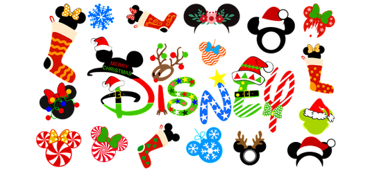 Celebrate the festive spirit with a vibrant collection of Disney-themed Christmas icons, featuring stockings, hats, and cheerful motifs!UV Transfers dtf prints