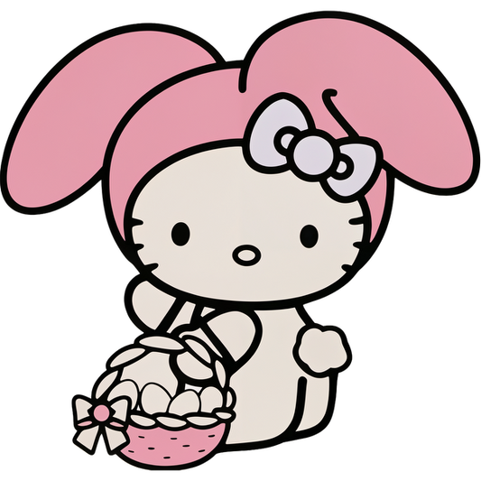 A cute cartoon character with pink ears and a bow, holding a basket filled with eggs.DTF Transfers dtf transfers
