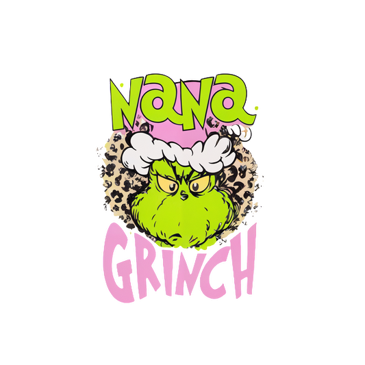 Playful Nana Grinch design featuring a stylishly green Grinch with a leopard print background, perfect for holiday spirit!DTF Transfers dtf prints