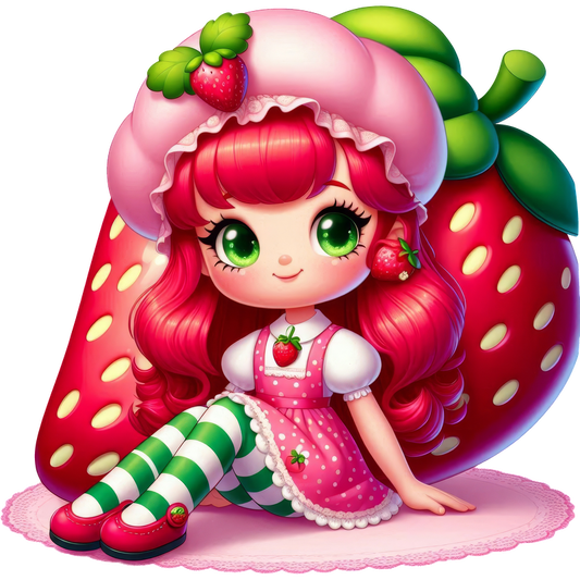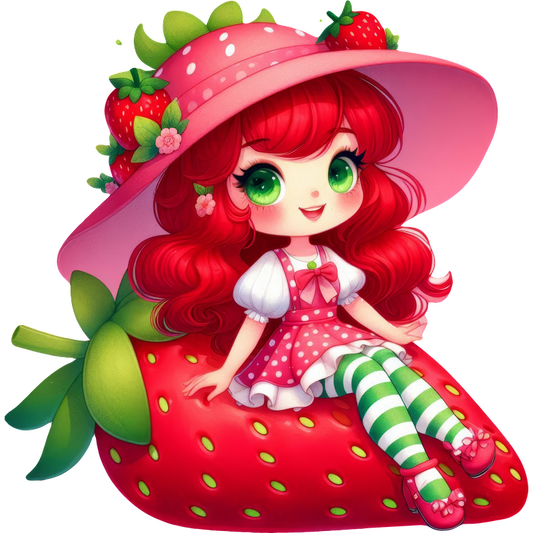 This adorable strawberry-themed character features bright green eyes, vibrant red hair, and a playful outfit with striped stockings.DTF Transfers