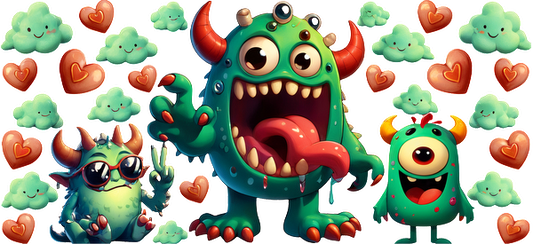 A playful collection of colorful, cartoonish monsters with big smiles and hearts, perfect for a fun-filled theme!UV Transfersdtf regular iron