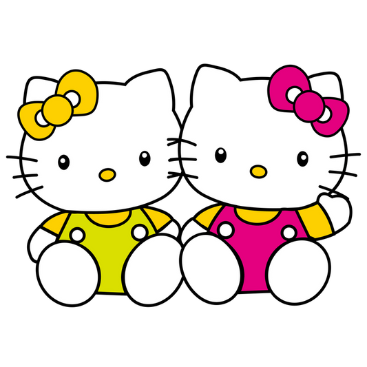 Adorable cartoon kittens dressed in vibrant yellow and pink outfits, showcasing their signature bows and cheerful expressions.DTF Transfers