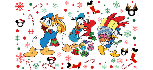 A cheerful illustration featuring Donald Duck and friends joyfully carrying colorful gifts surrounded by festive decorations.UV Transfersdtf regular iron