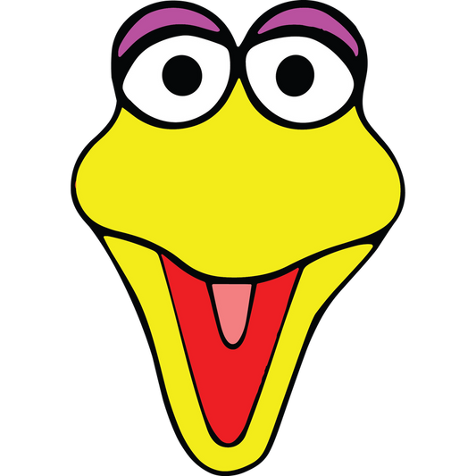 A cheerful yellow cartoon character face with large eyes, a wide open mouth, and purple eyebrows, exuding a playful vibe.DTF Transfers heat press transfers heat press transfers