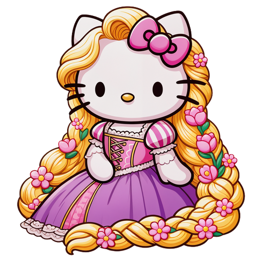 A charming Hello Kitty character styled as Rapunzel, featuring long braided hair adorned with flowers and a lovely purple dress.DTF Transfers dtf prints