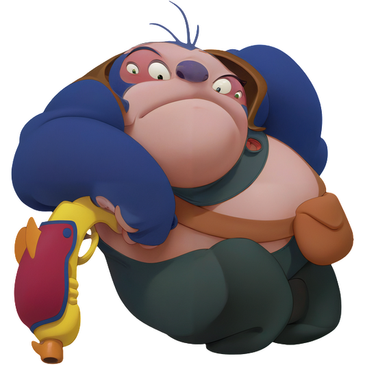 Un personaje regordete y caricaturesco, con rasgos exagerados y un traje azul, que sostiene una pistola de juguete colorida en una postura lúdica. Transferencias DTF
