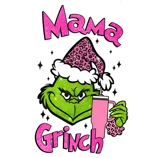 A playful design featuring the iconic Grinch with a pink leopard-print hat, holding a drink, complemented by sparkly text.DTF Transfersdtf regular iron dtf prints