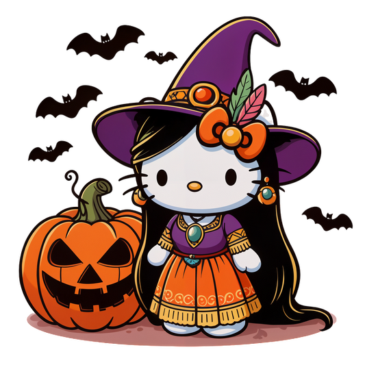 This adorable Halloween-themed character features a witch outfit with a purple hat, alongside a carved jack-o'-lantern.DTF Transfers