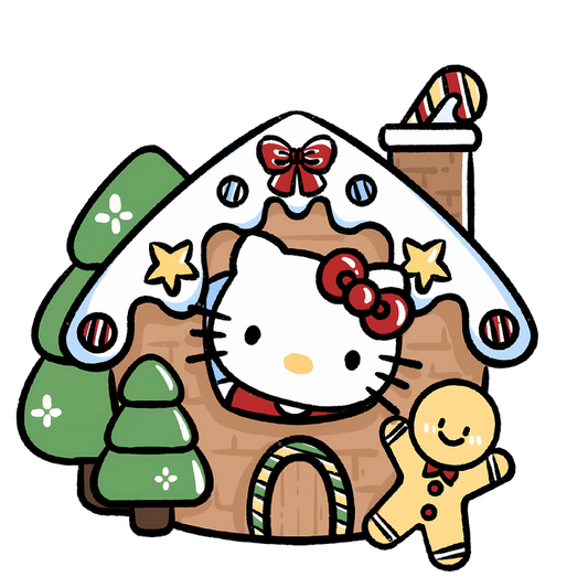 A cheerful Hello Kitty gingerbread house with candy decorations, surrounded by festive trees and a cute gingerbread man.DTF Transfers