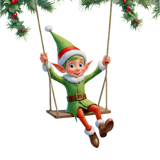 Un elfo alegre con un traje verde y un gorro de Papá Noel se balancea alegremente, rodeado de vegetación festiva. Transferencias DTF