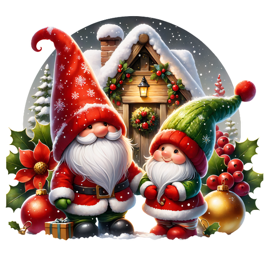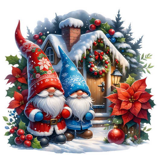 Two cheerful gnomes, dressed in festive red and blue, stand in front of a cozy, snow-covered holiday cottage.DTF Transfers