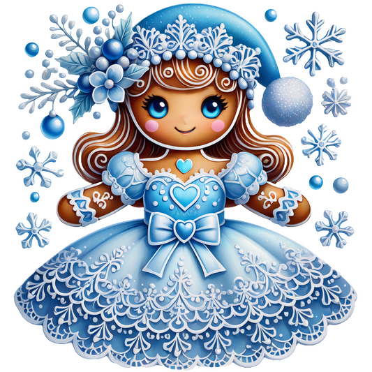 Una encantadora niña de jengibre adornada con un vestido azul brillante, completo con una corona de copos de nieve y detalles helados. Transferencias DTF