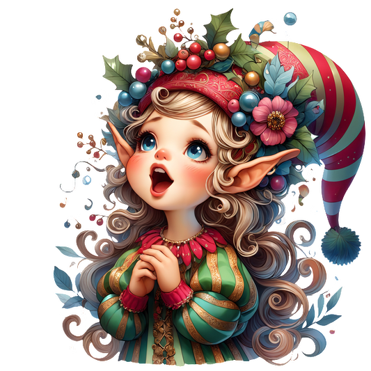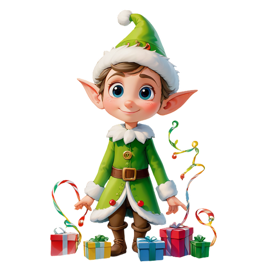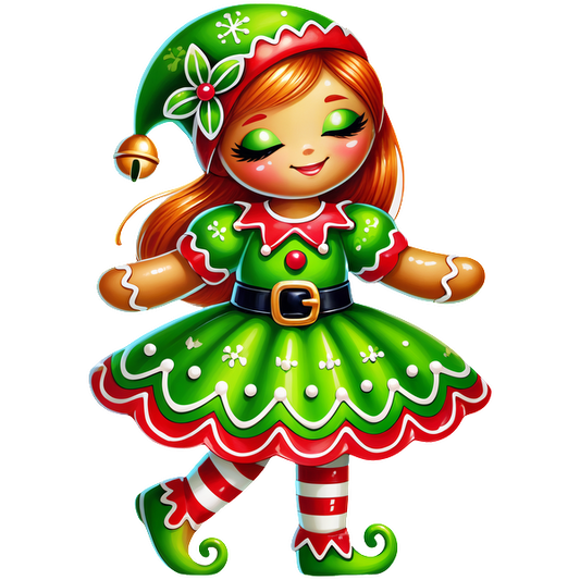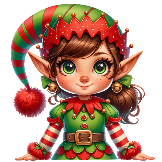 A cute, cartoon-style elf girl with vibrant green and red attire, complete with a playful hat and cheerful expression.DTF Transfersdtf regular iron