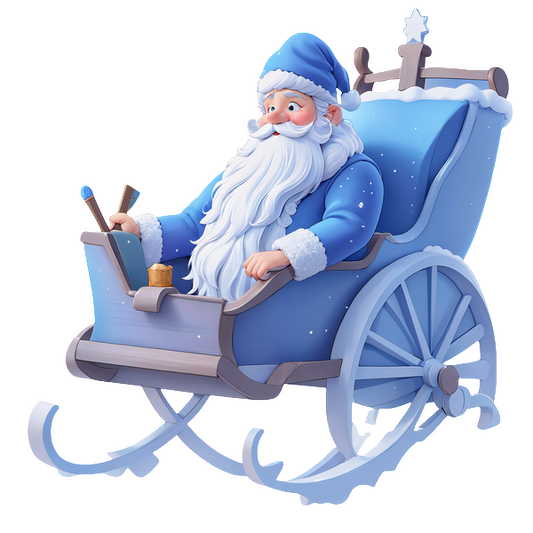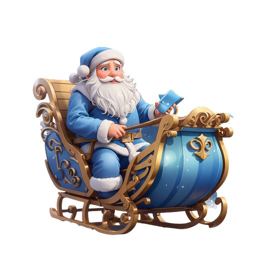 Un alegre Papá Noel en un trineo azul decorativo sostiene una taza y parece estar listo para las aventuras navideñas. Transferencias DTF