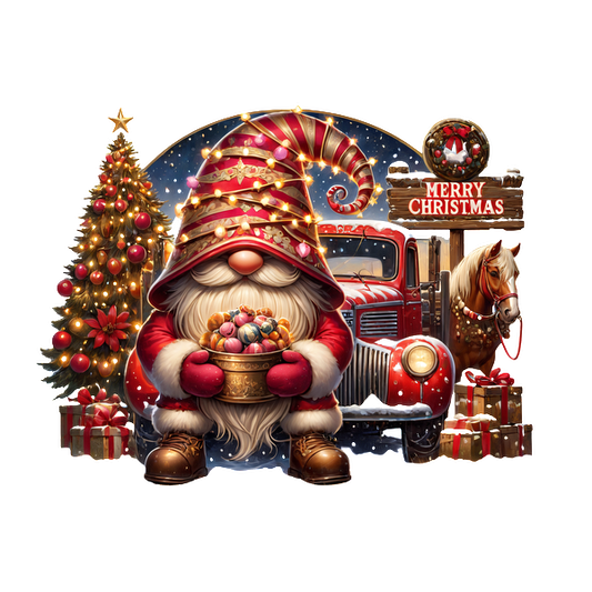 Un gnomo alegre y festivo sostiene un cuenco de golosinas coloridas frente a un árbol de Navidad, un camión antiguo y un caballo. Transferencias DTF