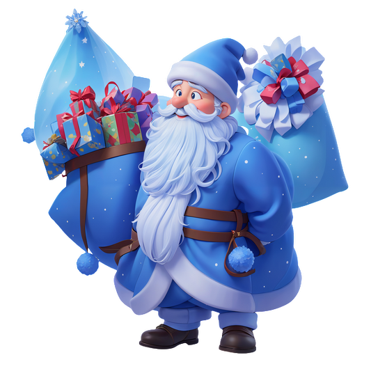 Un alegre Papá Noel vestido de azul lleva dos sacos festivos llenos de regalos coloridos, difundiendo alegría y encanto navideños. Transferencias DTF