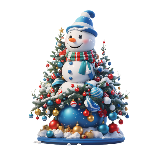 Festive Christmas decoration featuring a cheerful snowman adorned with a colorful scarf, surrounded by vibrant ornaments and snowy accents.DTF Transfers dtf transfers
