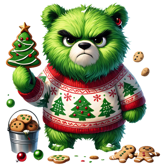 A grumpy green bear in a festive sweater holds a Christmas tree cookie, surrounded by cookies and holiday decorations.DTF Transfers heat press transfers