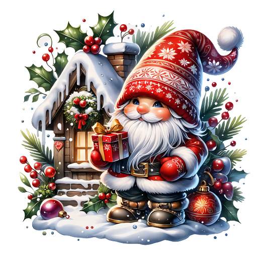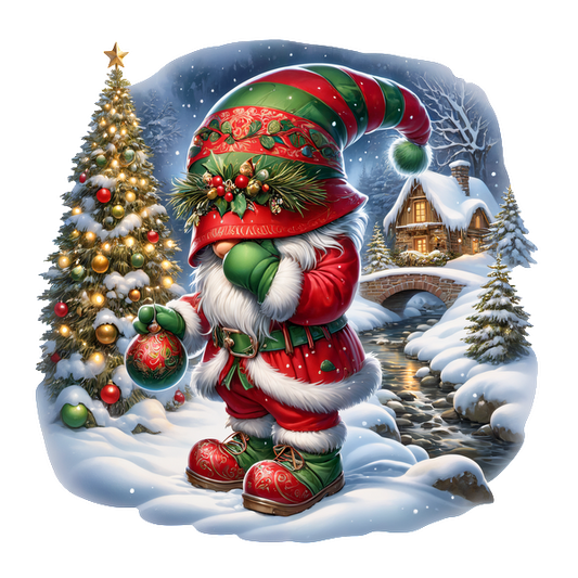 A festive gnome in a vibrant red and green outfit holds a Christmas ornament, surrounded by a snowy scene with a decorated tree.DTF Transfers dtf prints
