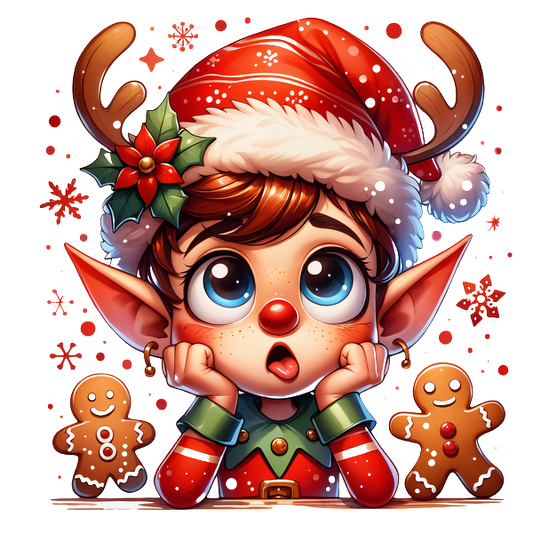 A whimsical Christmas elf with antlers and a festive hat, gazes happily at gingerbread cookies surrounded by holiday decorations.DTF Transfers heat press transfers