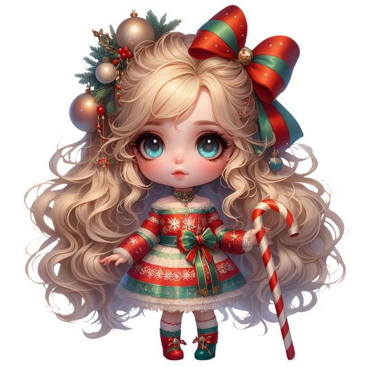 This adorable Christmas doll features long, curly hair adorned with festive ornaments, wearing a striped dress and holding a candy cane.DTF Transfers