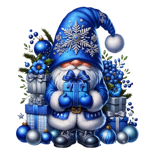 Un alegre gnomo azul de Papá Noel con un gorro de copo de nieve sostiene un regalo entre adornos festivos y presentes en tonos azules. Transferencias DTF