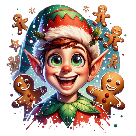 Un alegre elfo joven, ataviado con un atuendo festivo y rodeado de divertidas galletas de jengibre, irradia alegría y emoción navideñas. Transferencias DTF