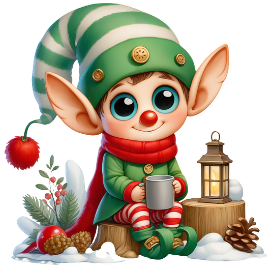 A cheerful, cartoonish elf in a green and red outfit sits on a log, holding a mug beside a lantern.DTF Transfers heat press transfersdtf regular iron