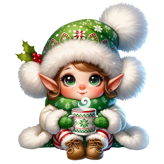 A cheerful elf in a festive green hat and scarf enjoys a warm drink, embodying the holiday spirit.DTF Transfers heat press transfers