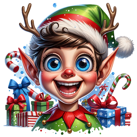 A cheerful elf boy with bright blue eyes, antlers, and a festive outfit is surrounded by colorful presents and candy canes.DTF Transfers dtf prints