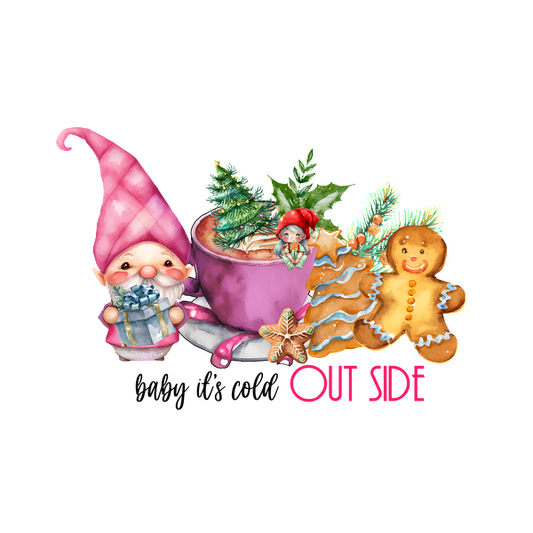 Escena festiva que presenta un gnomo alegre, una taza acogedora con vegetación, una galleta de jengibre y divertidos elementos navideños.