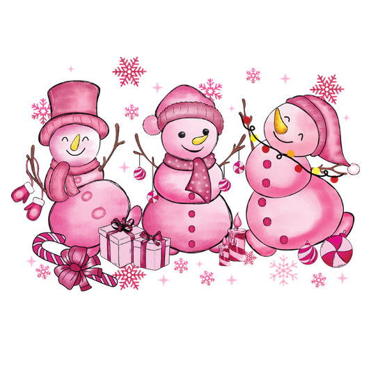 ¡Tres adorables muñecos de nieve rosados adornados con sombreros y bufandas, rodeados de regalos y decoraciones festivas, perfectos para la alegría navideña!