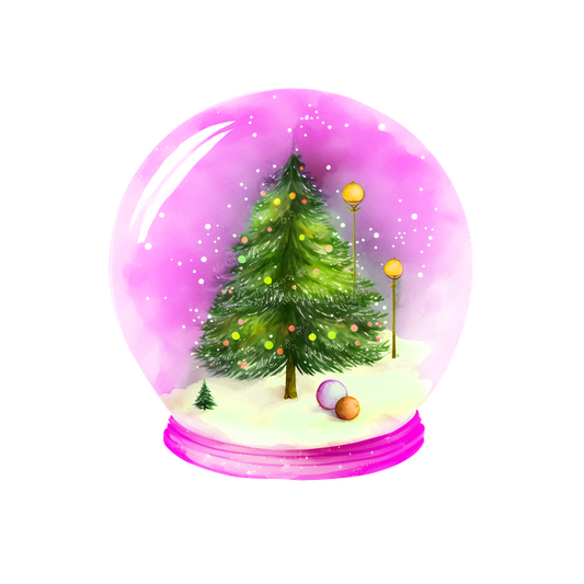Una extravagante bola de nieve que presenta un árbol de Navidad colorido y adornos festivos sobre un fondo rosa suave.