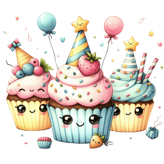 A whimsical illustration of three cheerful cupcakes adorned with fun toppings, party hats, and colorful balloons, perfect for celebrations!DTF Transfers