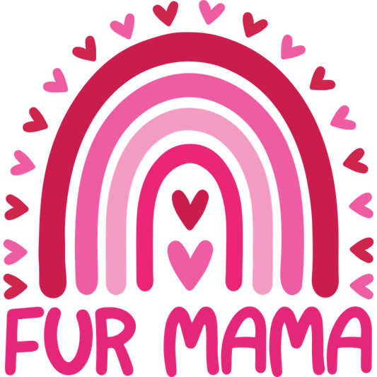 A cheerful design featuring a multicolored rainbow and the phrase "Fur Mama," adorned with playful hearts.DTF Transfers