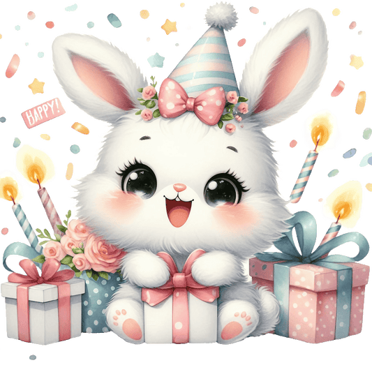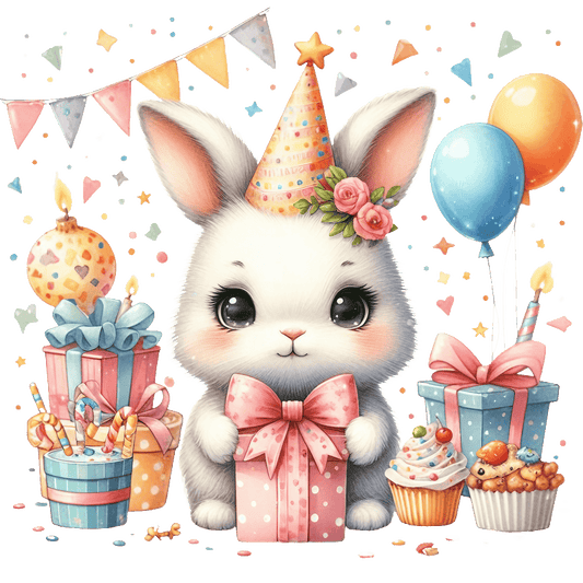 A cute, festive bunny wearing a party hat surrounded by gifts, balloons, cupcakes, and colorful decorations for a celebration.DTF Transfers