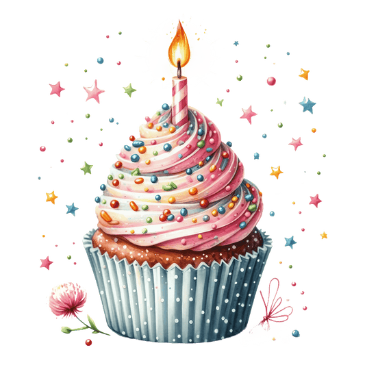 A deliciously decorated cupcake topped with swirls of pink frosting, colorful sprinkles, and a candle, surrounded by playful stars.DTF Transfers