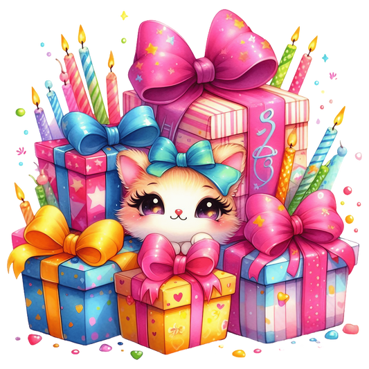 A cute kitten peeks out from behind colorful gift boxes adorned with vibrant bows and festive candles, perfect for celebrations!DTF Transfers